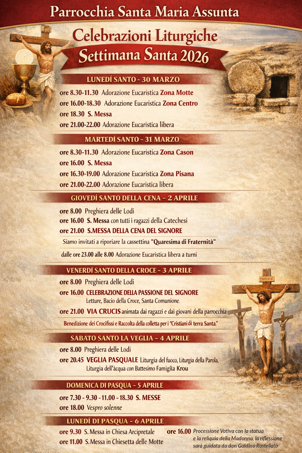 La comunità parrocchiale si prepara a vivere la Settimana Santa 2026 con un ricco calendario di celebrazioni liturgiche, momenti di adorazione e appuntamenti comunitari.