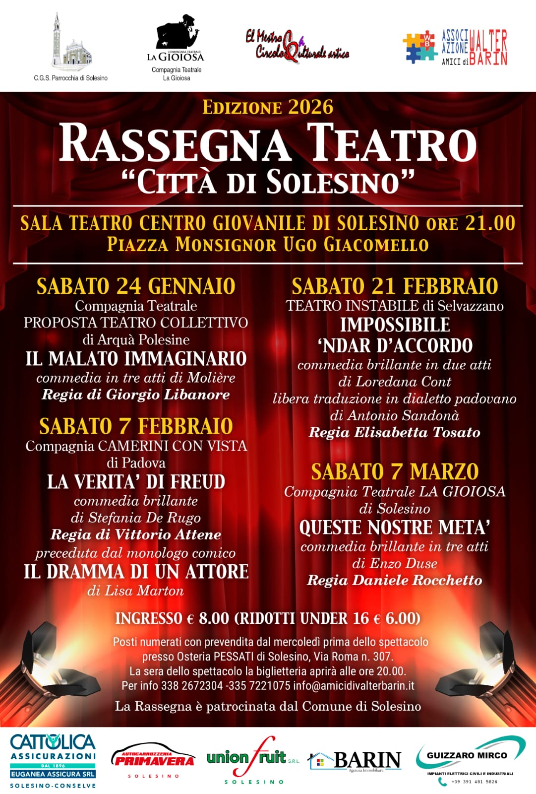 Dal 24 gennaio al 7 marzo 2026 torna la Rassegna Teatro “Città di Solesino” presso la Sala Teatro del Centro Giovanile.